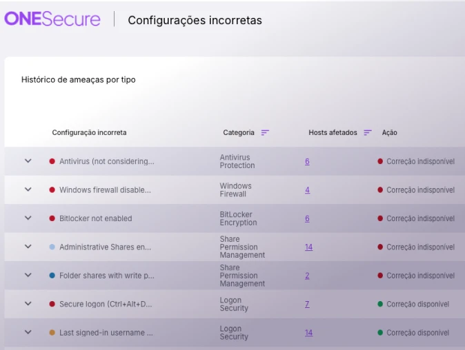 Todos os achados críticos do Endpoint Central exibidos no OneSecure.